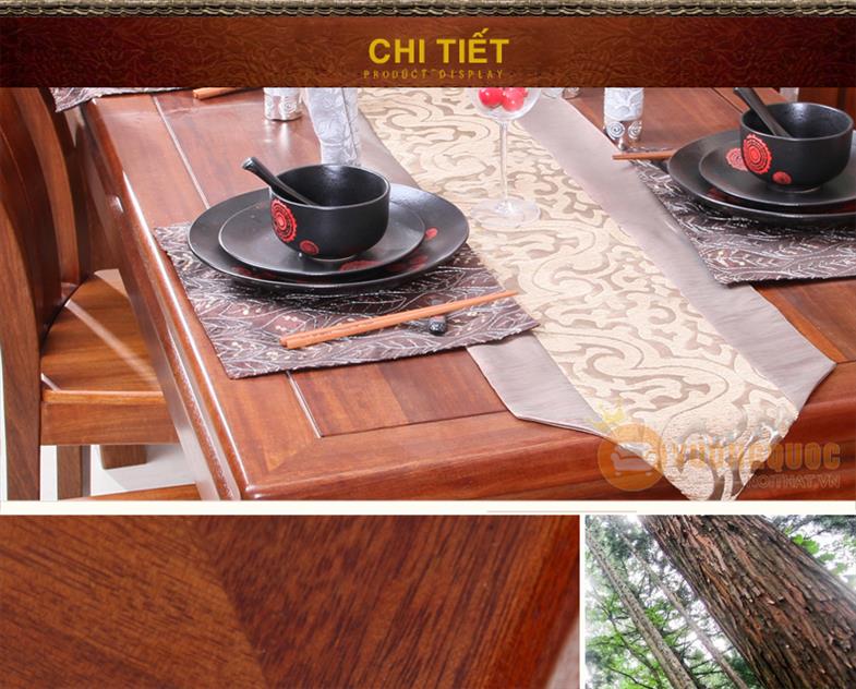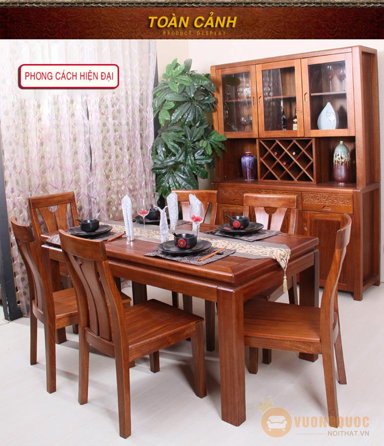 Đây là bộ bàn ghế phòng ăn hiện đại phong cách Trung Hoa, toàn bộ bàn và 6 ghế ăn cùng được làm bằng chất liệu gỗ nhập khẩu cao cấp, chống mối mọt cao, dễ dàng lau chùi, an toàn cho người sử dụng.